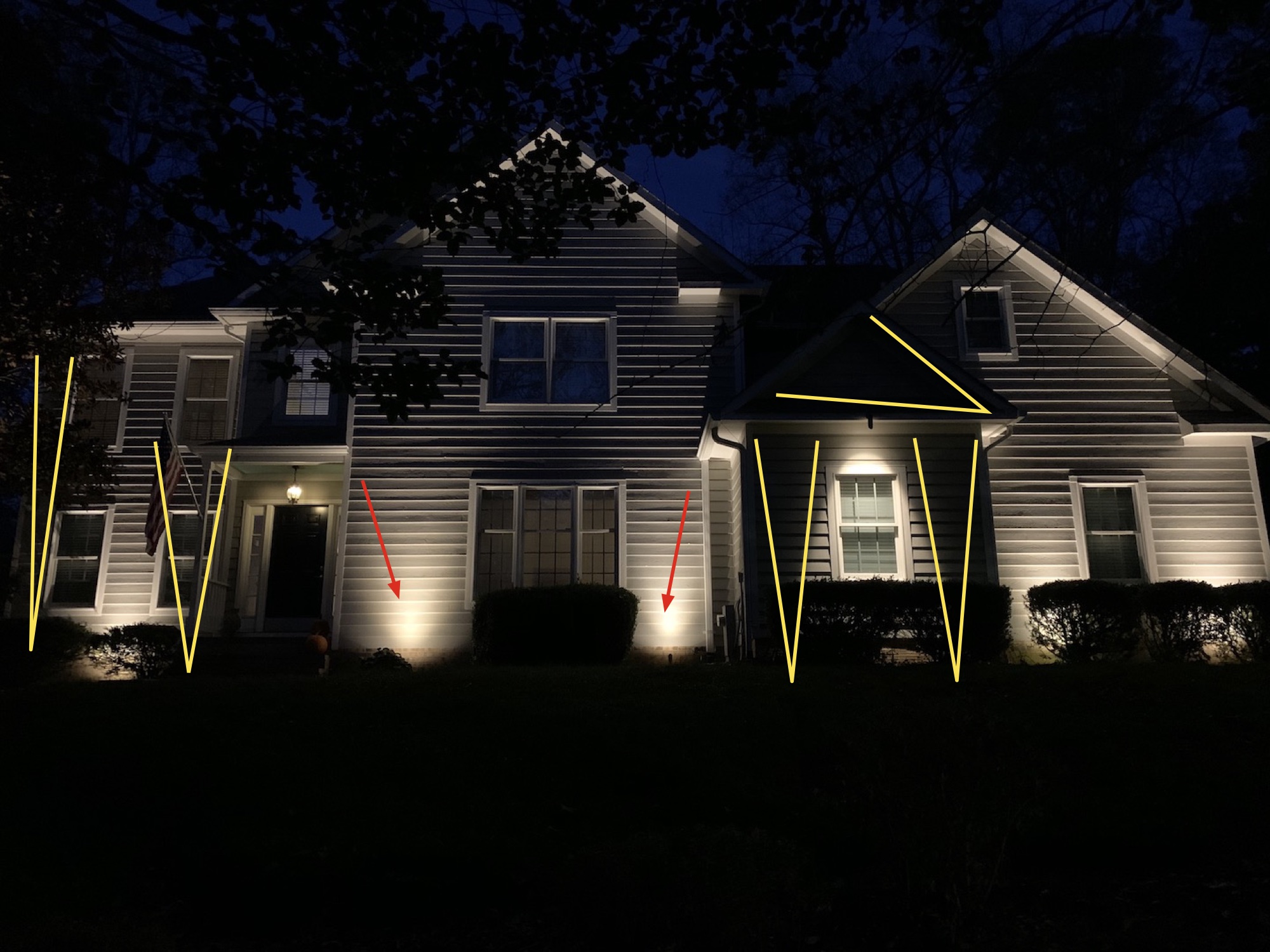 Evan, Thank you for the assistance getting my initial project finished. As you can see from the first image--I added uplight between the windows and a downlight above the bump out as you suggested. I would now like to expand my lighting to the landscaped area in front of the house as seen in the second photo. The second photo is taken from the street. I haven't started the landscaping project yet...however would prefer to get some light in the mulched areas. Can you make any suggestions? Thanks!
