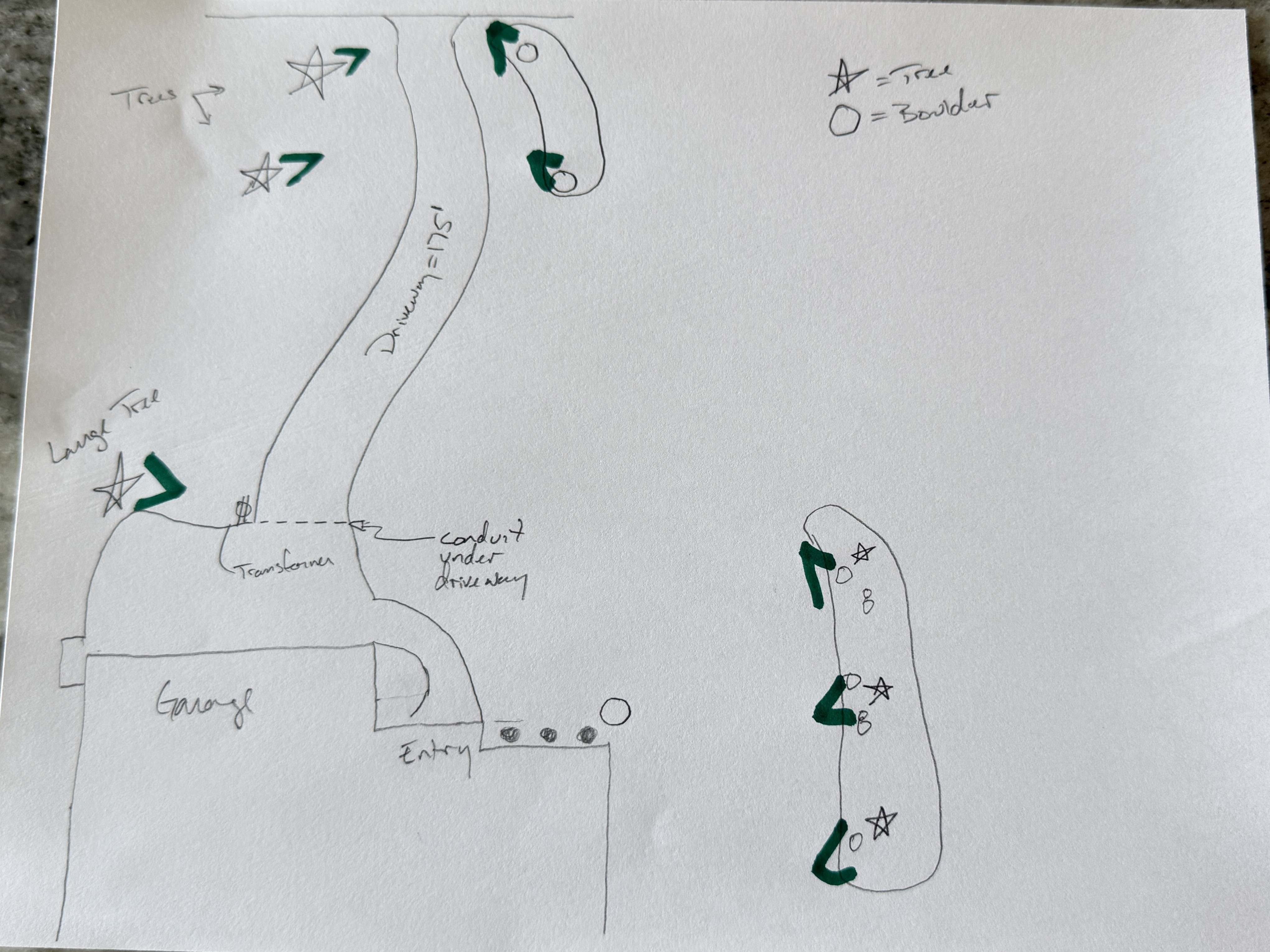 I purchased a Costco kit (10 spot + 7 path + 150 watt transformer) and hoping for some community direction on light placement and wiring layout. I have a longer driveway at about 175' from furthest light to transformer which I'm thinking to place at end of concrete apron (where driveway transitions to asphalt). I currently have a PVC pipe buried under driveway to get to other side as well. I've also roughly diagramed layout and initial thoughts on light placement.